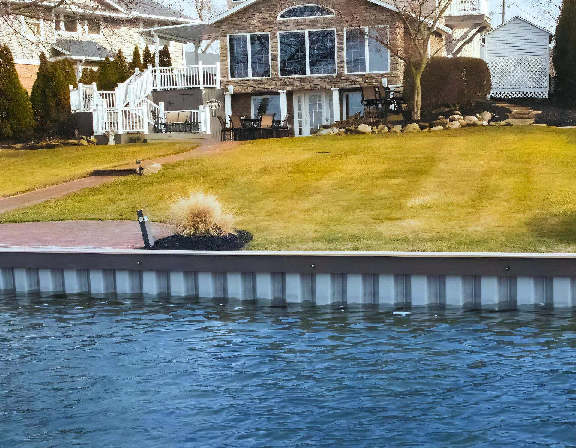 Vinyl sheet piling that is vibrated into the ground and topped with either an all-wood boardwalk for a rustic look, or you can wrap the wood with a maintenance-free synthetic for a modern look.